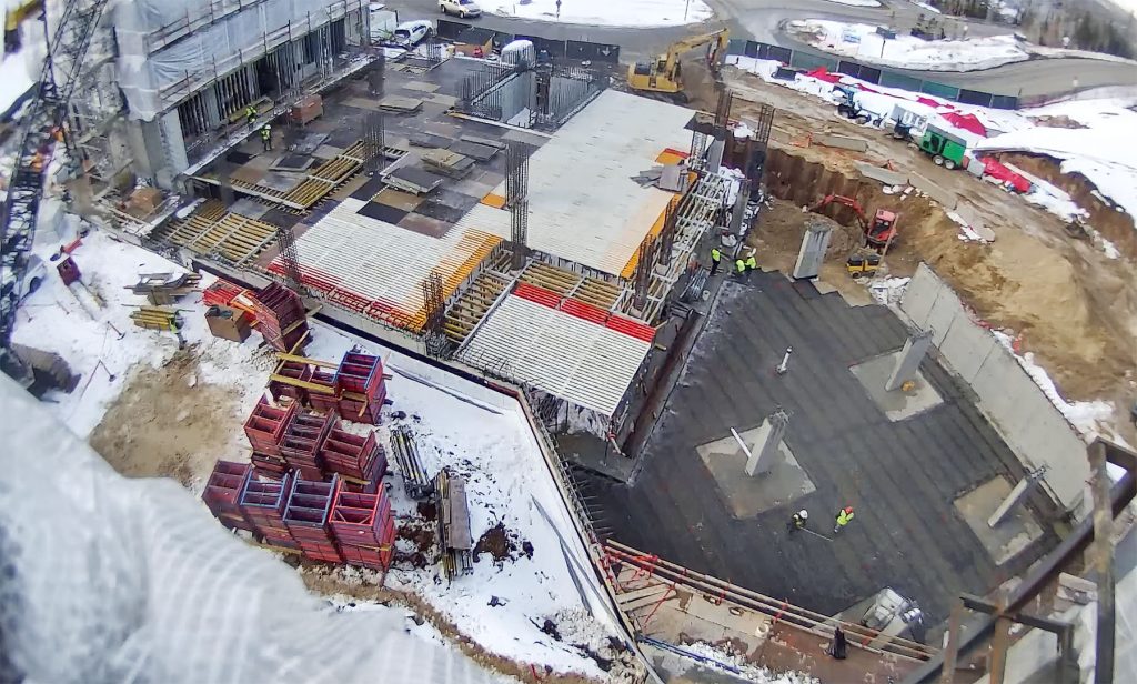 Above: Another view of Building B, Level Five, from the Ruby Express chairlift. Crews are placing plumbing sleeves and steel rebar. Soon, they will be ready to place the PT-cables and then pour concrete. On the northern end of the building, crews are working on the top of the north elevator core at Level Seven. Inside, most of the wall framing is complete, with mechanicals now being run. December 31, 2025.