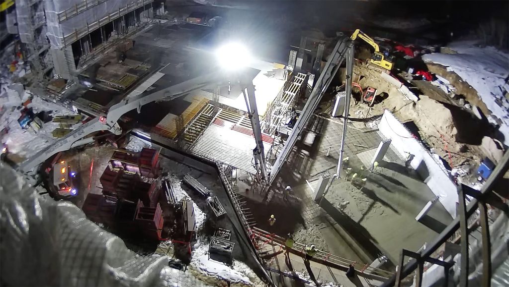 Above: The image shows crews working on an early-morning pour of concrete for the Garage Level floor that will connect the garages of Building A to Building B. December 12, 2025.