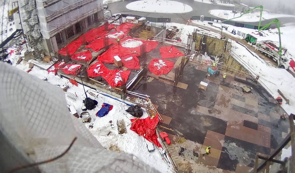Above: The last of the remaining below-grade concrete walls and columns are mostly complete at the Garage Level, which connects Building A to Building B. Crews are pouring these final walls above. The temporary shoring deck is nearly complete, forming the cap of the garage below the Arrival Lobby. The work above shows crews removing large red blankets that protect the site from snow. Completing the last portion of the below-grade components is a significant milestone for the project. December 30, 2025.
