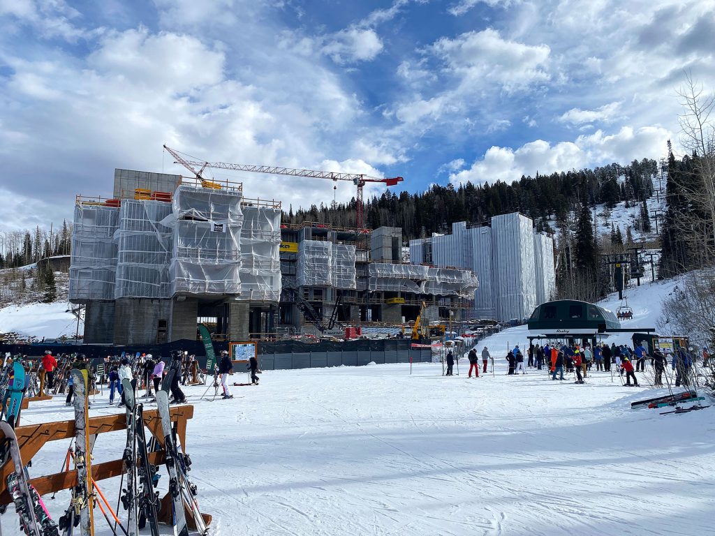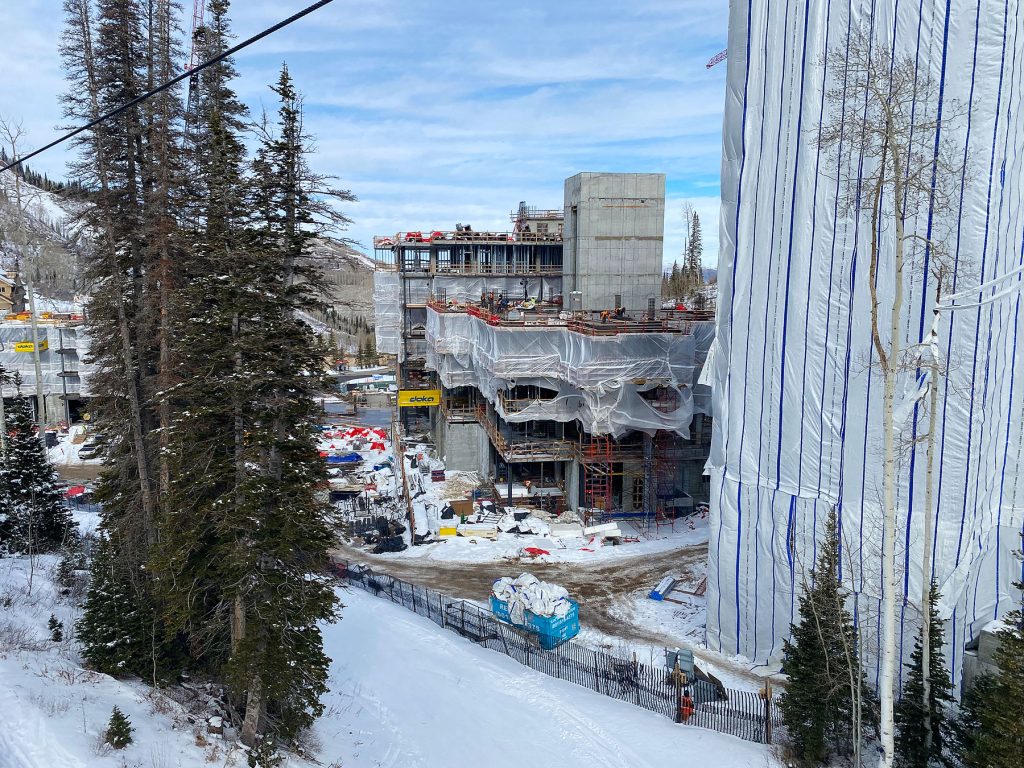 Above: A view of the project from the ski beach in front of the Deer Valley Empire Canyon Day Lodge. Building C in the back is fully wrapped to protect the interior from the snow and cold. Building B is nearing its full height and mass. Building A at the front is partially wrapped with ongoing interior work in process. December 31, 2025.